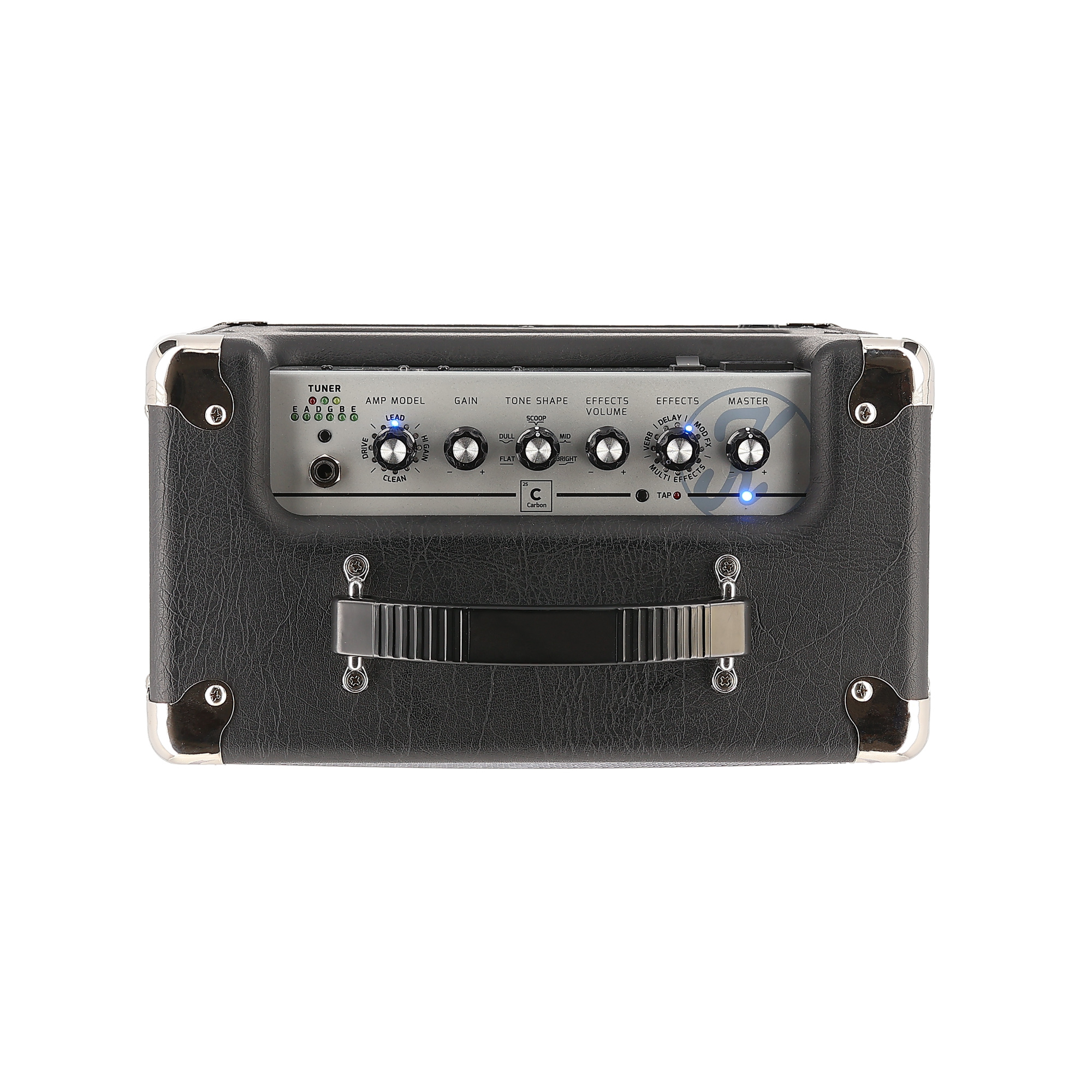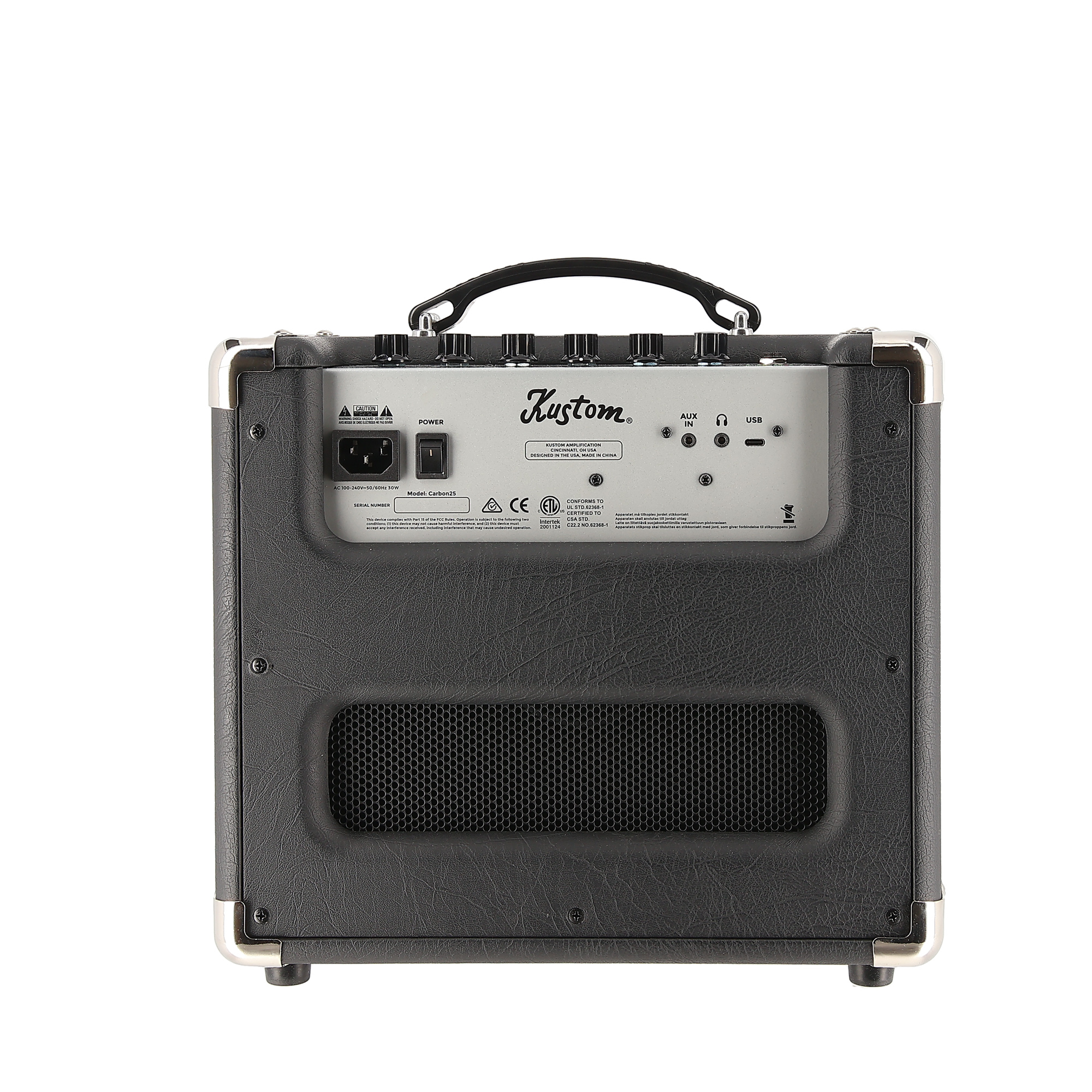 The Kustom Carbon 25 modeling guitar amplifier uses state of the art digital technology to offer guitar players a wide variety of high-quality amplifier models and effects options in one compact package. The Carbon 25 allows the player to choose from one of 12 amplifier types – everything from pristine clean tones and classic overdrives to high gain crunch and solo tones. 12 on-board effects including reverbs, delays, modulation and special combo effects, an EQ preset knob featuring five unique EQ curves, USB audio interface and an on-board tuner make the Carbon 25 the perfect option for everyone from beginner to accomplished player who wants great tone and effects in a small package for playing and recording at home or on small stages.